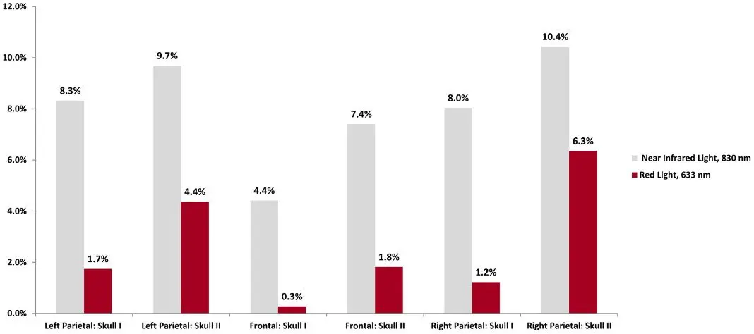The answer is yes but with caveats; this requires an appropriate wavelength (nm) and sufficient irradiance (mW/cm²) In this demonstration with a real human skull, the Vielight Neuro, emitting 810 nm near-infrared light at an industry-leading irradiance of 250 mW/cm², clearly passes through the skullcap.