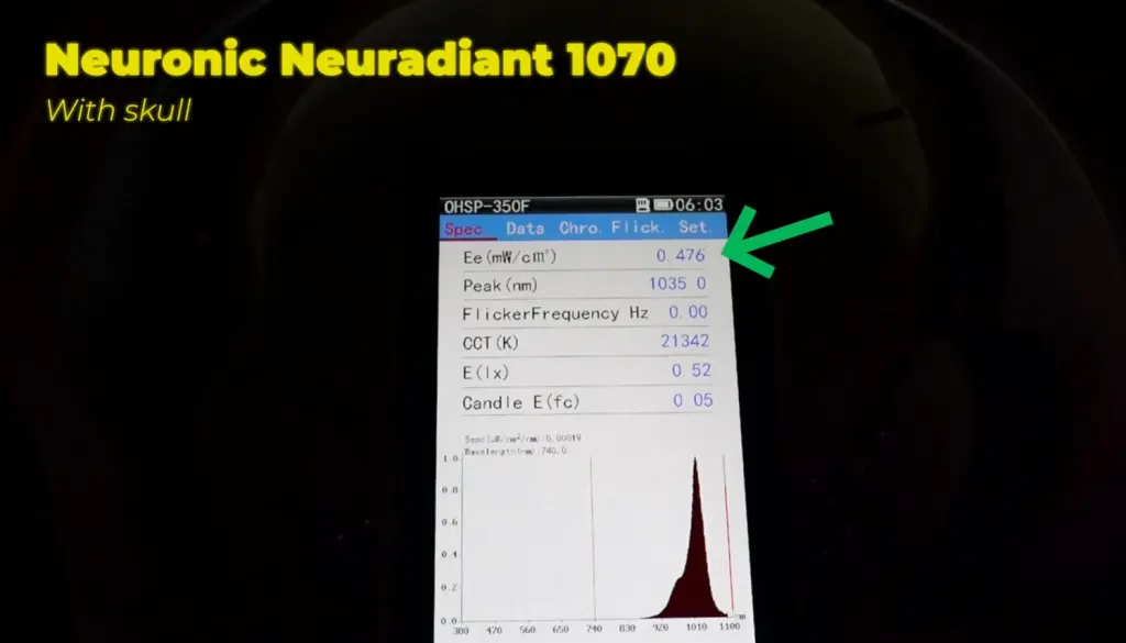 The Vielight Neuro delivered ~21 mW/cm2 of irradiance through a real human skull when measured with a spectroradiometer. The Neuronic Neuradiant delivered just 0.476 mW/cm2 through a real human skull.